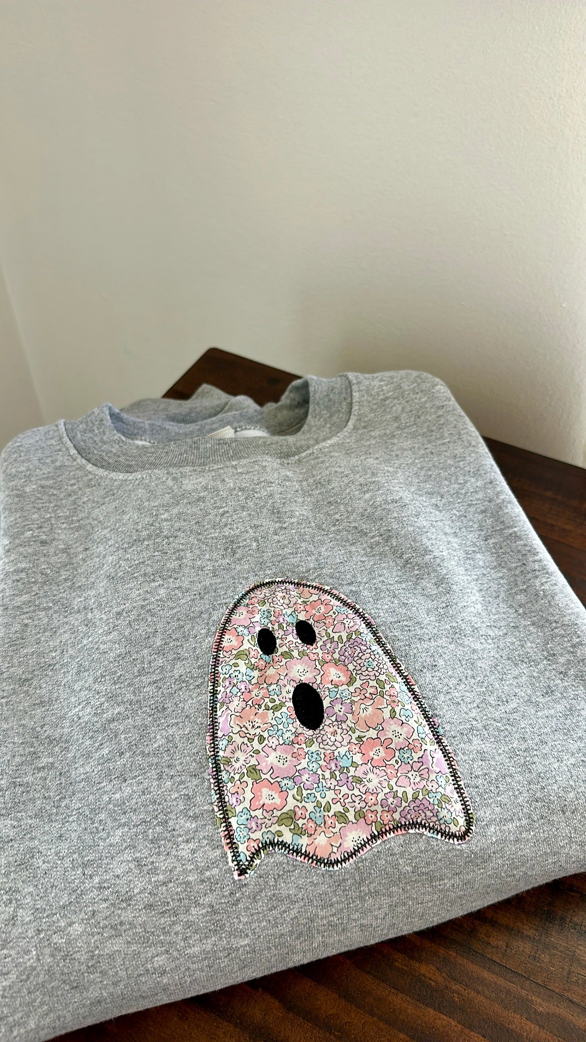 Appliqué Ghost Sweatshirt on a steel gray Hanes EcoSmart crewneck.