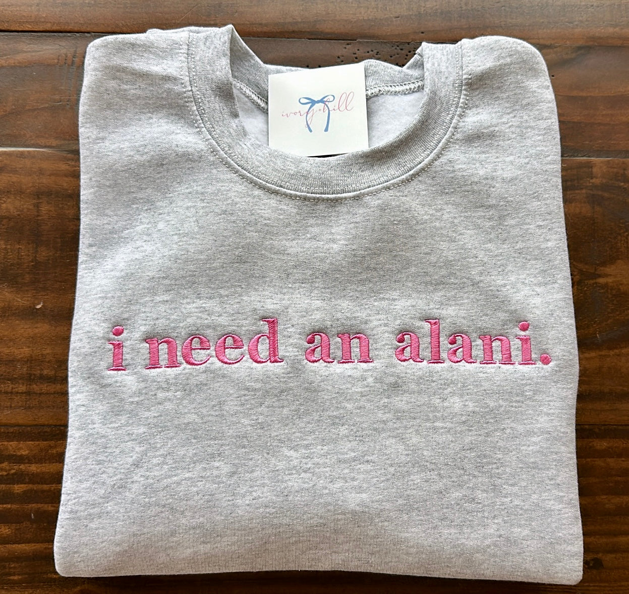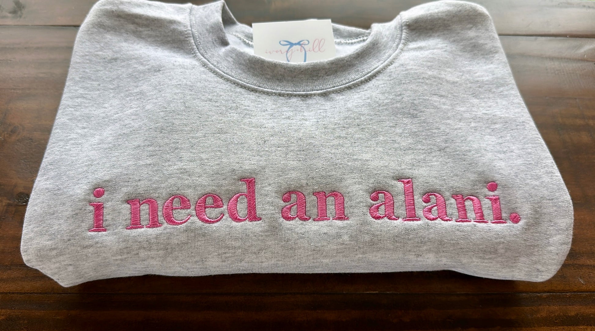 “i need an alani” funny slogan sweatshirt in hot pink thread