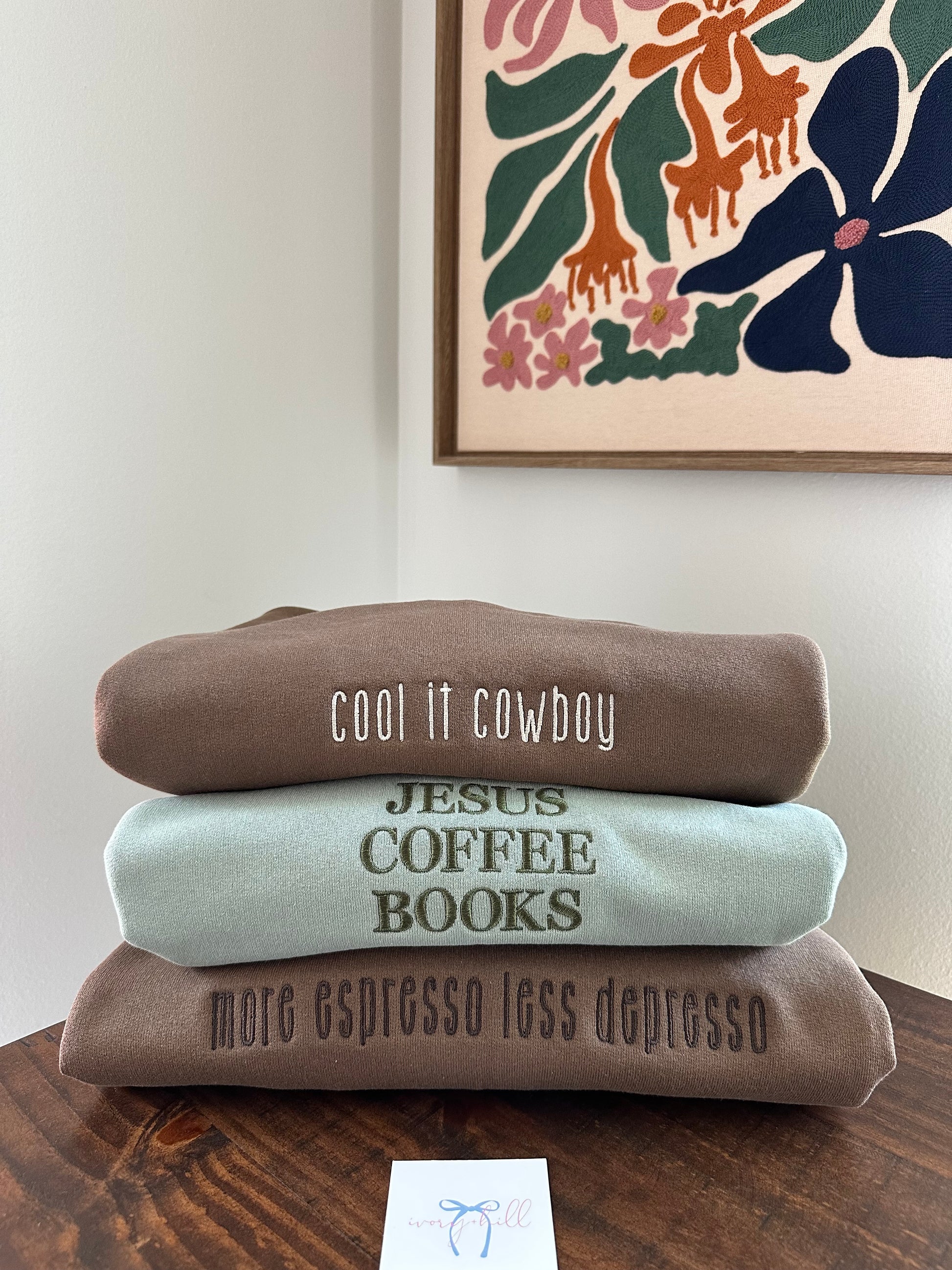 Want to change your colors or sweatshirt? Just list any changes in the embroidery box!