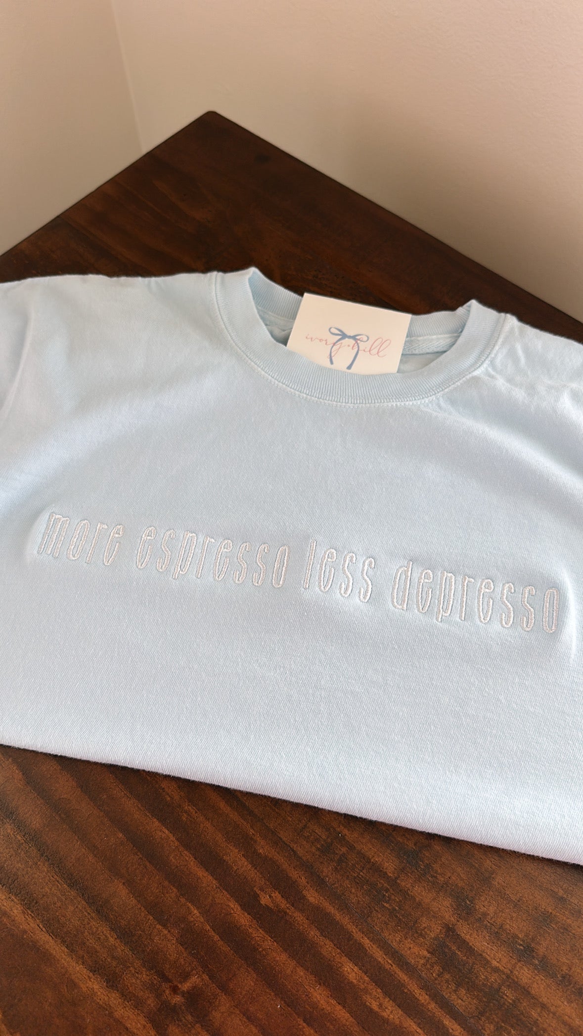 This chambray blue Comfort Colors boxy tee is embroidered with “more espresso less depresso” in white thread — or choose your own thread color to make it yours. Perfectly relaxed, soft, and stitched just for you.